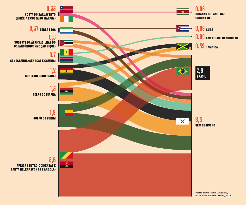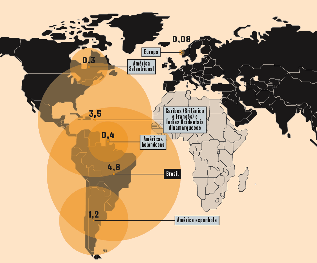 Veja abaixo as principais rotas do tráfico transatlântico entre 1501 e 1866 e o destino da maioria dos escravizados (em milhões).