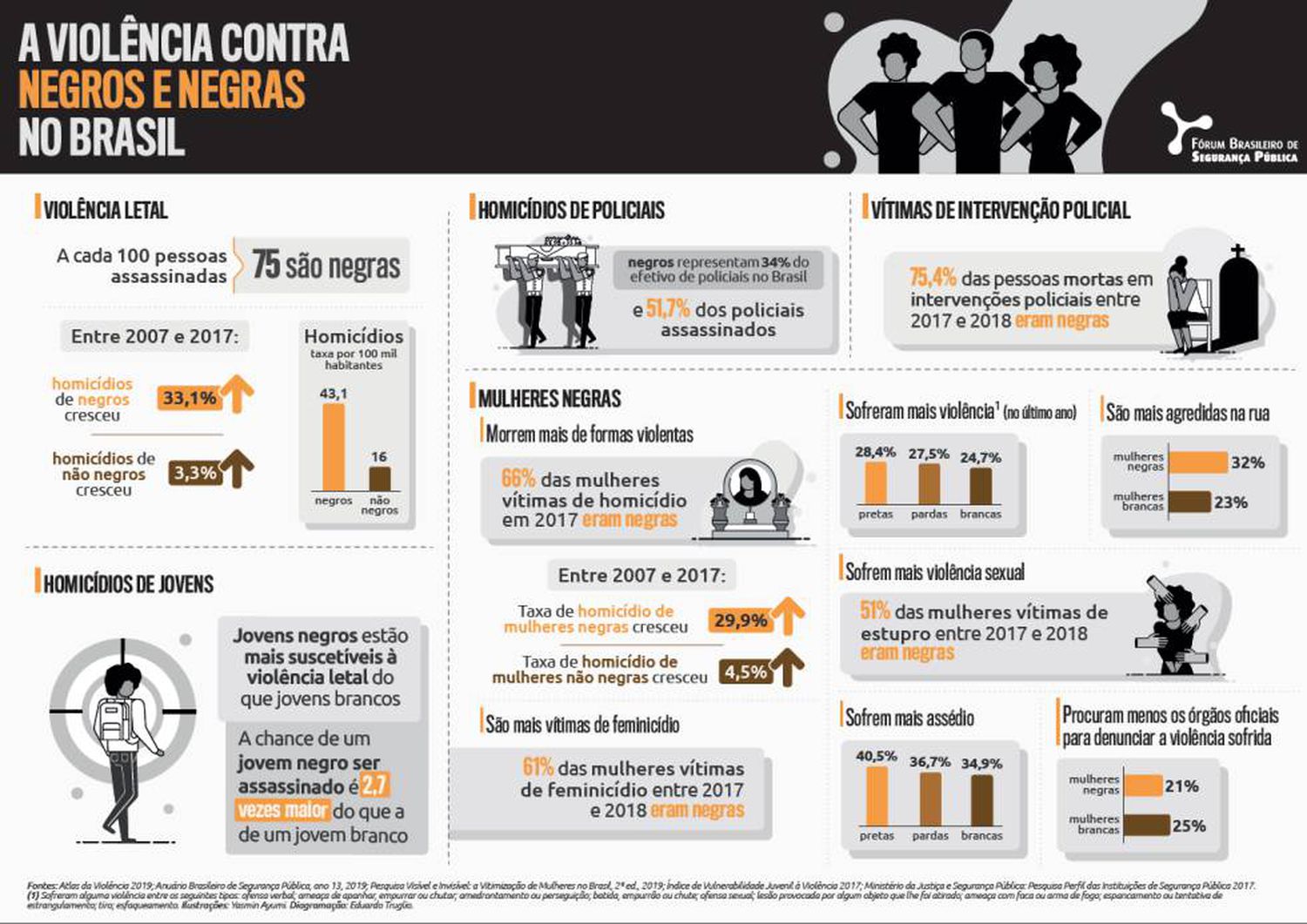 O racismo está na violência policial (João Pedro de 14 anos, foi assassinado dentro de casa, durante uma operação policial. Dois em cada três jovens mortos são negros; 79% dos policiais envolvidos são brancos), os livros didáticos (a maioria das histórias são contadas do ponto de vista branco), na instabilidade da produção intelectual negra que apenas recentemente tem sido reconhecida e valorizada, os estereótipos raciais que traduzem homens negros como suspeitos e mulheres negras como domésticas, estas são suas representações sociais possíveis a 132 anos. “O silêncio ea negação do racismo são os instrumentos mais eficazes para sua manutenção. A estratégia de visibilização do racismo brasileiro é uma das maiores demonstrações de poder deste país" afirma a socióloga Marcia Lima.